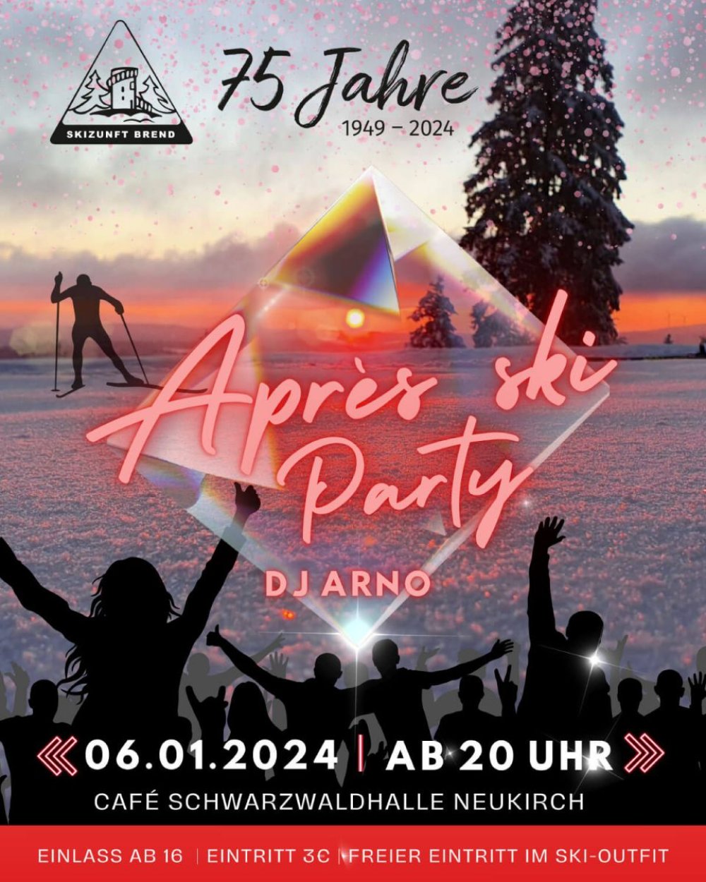 Bild 3: „Hoch die Hände - Am 6. Januar wird mit dem Traditionsrennen „Rund um Neukirch“ (wenn es die Schneeverhältnisse zulassen) ins Jubiläumsjahr 2024 gestartet. Auf alle Fälle findet abends eine grandiose Après-Ski-Party im Café der Schwarzwaldhalle Neukirch statt.