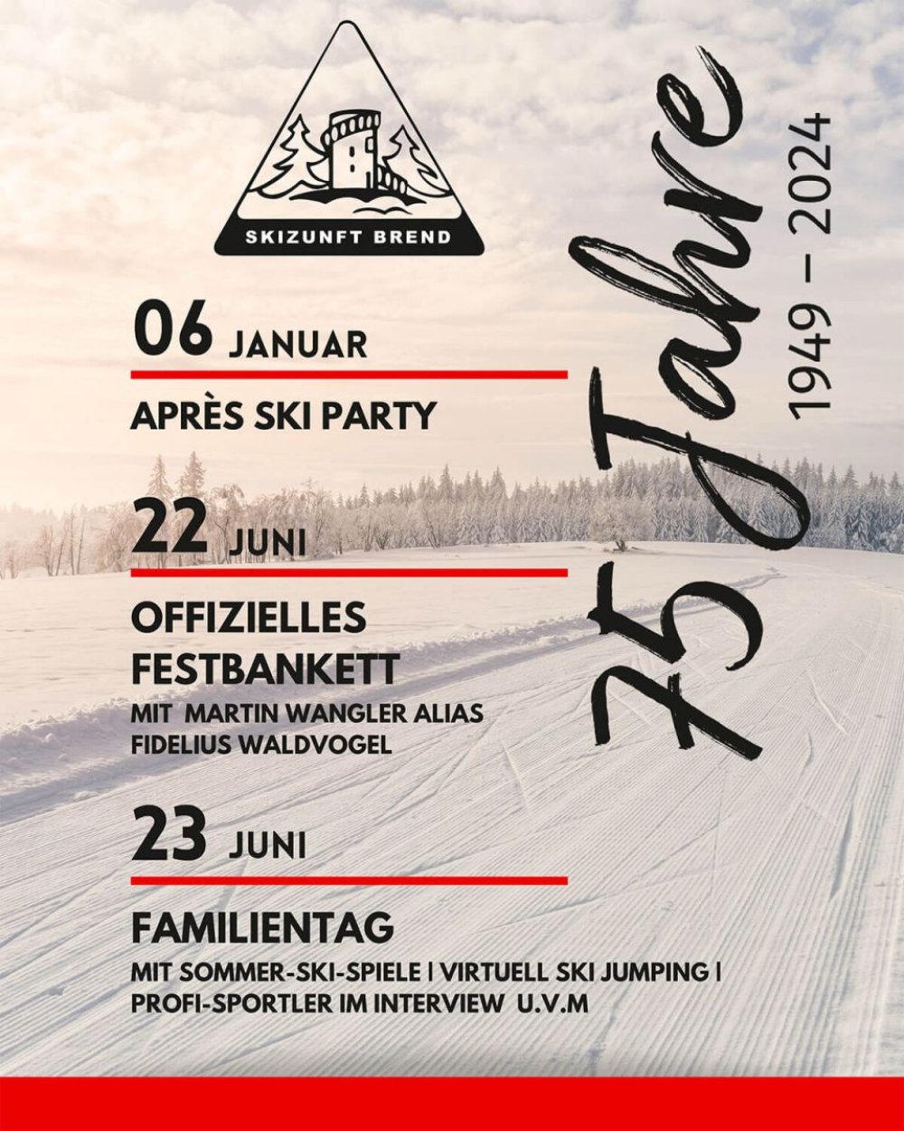 Das neue Jahr 2024 wird für die Skizunft Brend ein ganz Besonderes. Und zwar feiert der Traditionsverein sein 75-jähriges Jubiläum. Bereits am 6. Januar wird ins Jubiläumsfestjahr gestartet. So findet bei ausreichend Schnee das Traditionsrennen „Rund um Neukirch“ oder auch „Rund um den Brendschild“ statt. Der Tag wird mit einem Highlight abgerundet. Und zwar wird im Café der Schwarzwaldhalle Neukirch ab 20.00 Uhr eine Après-Ski-Party mit DJ und verschiedenen Bars gefeiert. Wer sich ins Après-Ski-Outfit schwingt, erhält freien Eintritt. Es verspricht ein grandioser Abend zu werden. Im Juni geht’s dann weiter. Neben einem offiziellen Festakt am 22. Juni, ist am 23. Juni ein sportlicher Familientag mit spannenden Sommer-Ski-Spielen, Virtuell Ski-Jumping, Profi-Sportlern im Interview u.v.m. geboten. Dieser Tag ist der Skizunft Brend eine besondere Herzensangelegenheit. Denn Spaß und Freude am Sport zu vermitteln – das ist bereits seit 75 Jahren die Mission der Skizunft Brend.