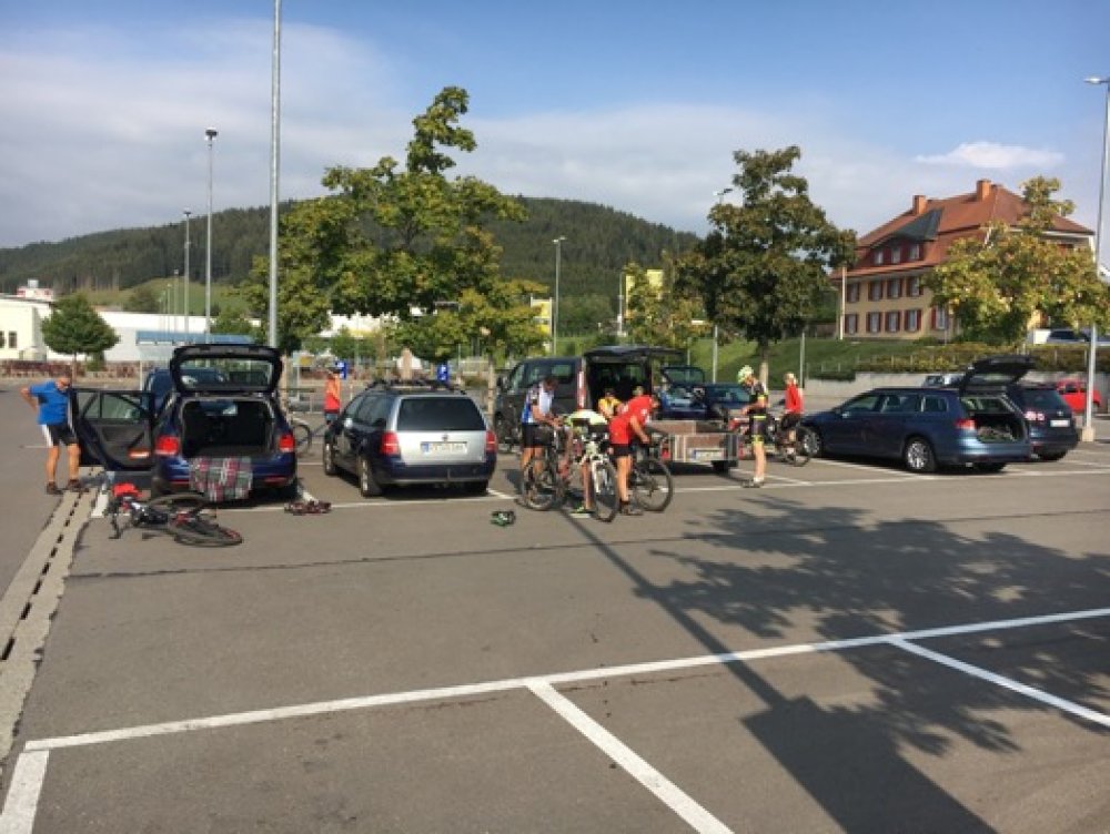 Wir trafen uns am Sonntag, den 19.08.2018 um 9:00 Uhr am Bregstadion. Mit dem Auto ging es dann über Neukirch nach Neustadt, wo wir beim großen Parkplatz zwischen Aldi und Schmidts-Markt genügend Parkplatzfläche fanden, um unsere Autos teilweise auch mit Anhänger zu parken.