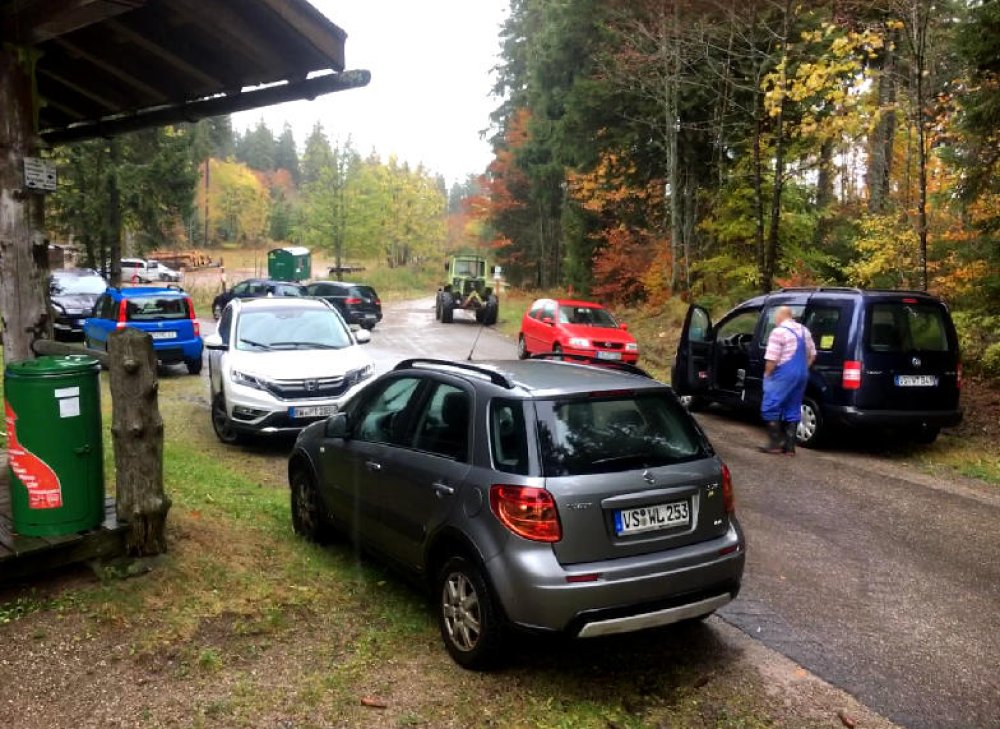 Trotz Regenwetters war der Parkplatz vor der Blockhütte mit den Autos der Helfer gut belegt. Für 2 Gruppen war vor dem Einsatz in der Loipe noch das Aufstellen des Schildes zu erledigen. Dazu mußte das relativ schwere Schild aus der Spurfahrzeuggarage herausgetragen und auf den bereitgestellten MB Trac von Michael gebracht werden. Anschließend wurde es zum Aufstellungsort beim Abzweig Richtung Brend gebracht und wiederum mit Muskelkraft aufgestellt. Es war schon gut, daß wir bei dem schweren Schild genügend Leute waren.